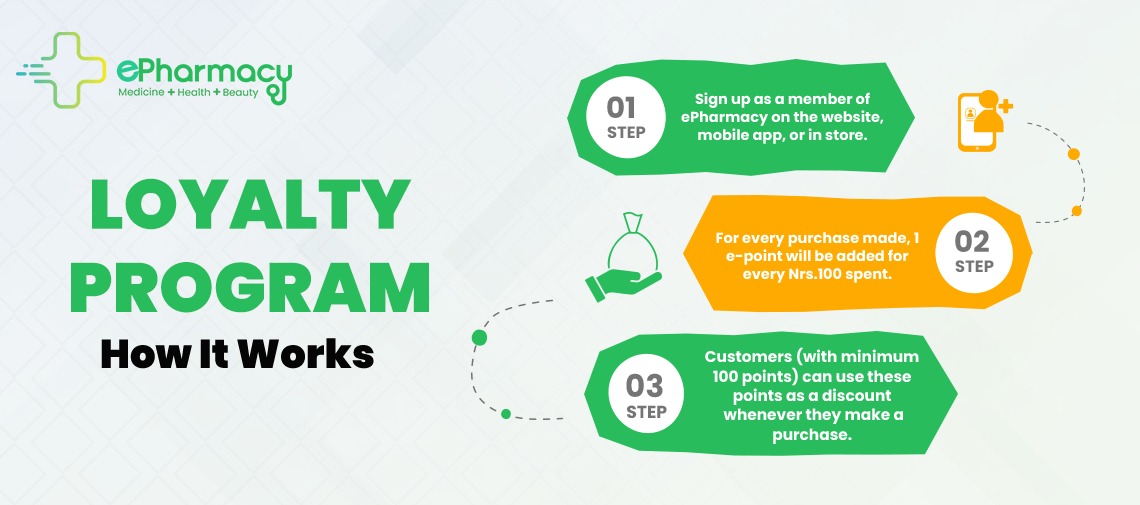 Customers can earn e-points on every order made through ePharmacy website, mobile app or on every purchase at ePharmacy stores. On every purchase made, 1 e-point will be added for every Nrs. 100 spent. (For online purchases, e-points shall be added after complete payment only)